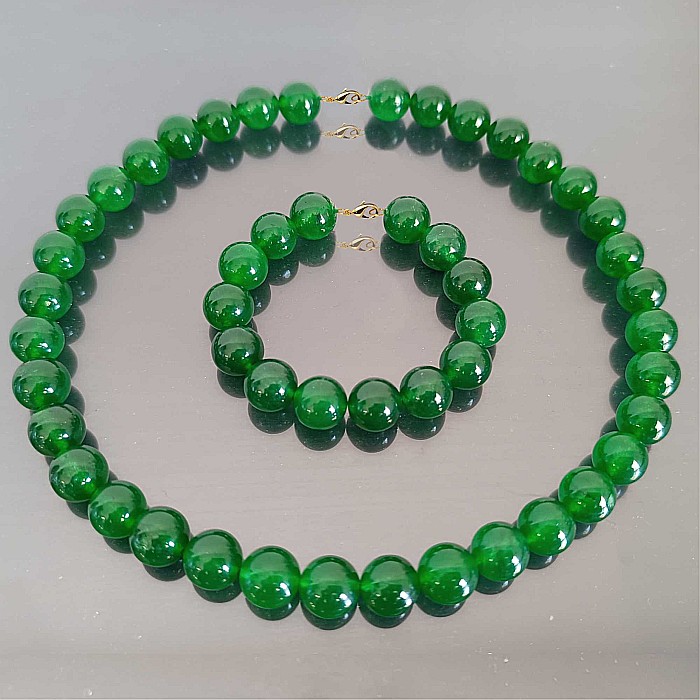Set Colier si Bratara cu Jad Verde Malaezian de 12 mm si Inchizatori din Aur de 14 k