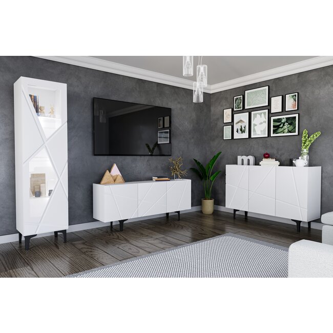 Set comodă + 2 vitrine Plasma Vicky, lemn masiv, finisaj premium, spațiu depozitare generos, comoda 180x49x65 cm + vitrine 80x46x218 cm, personalizabil