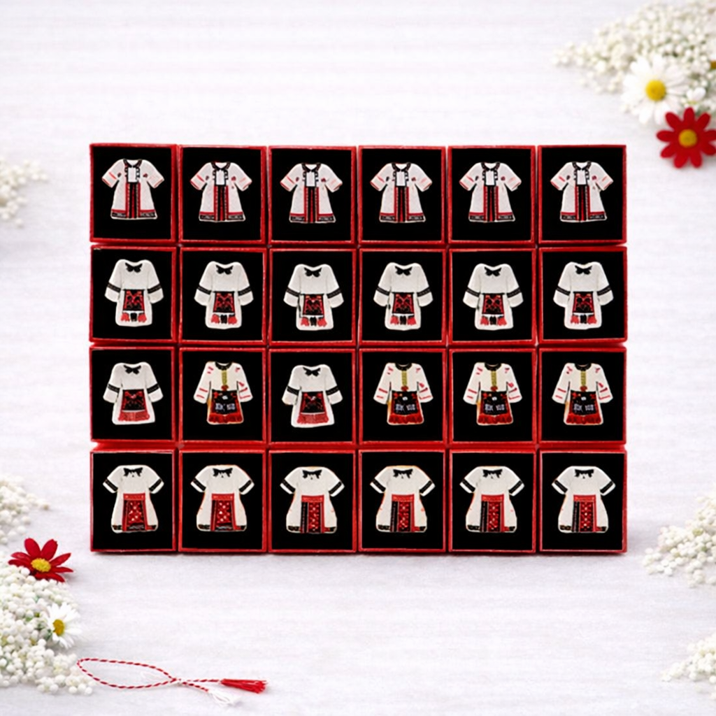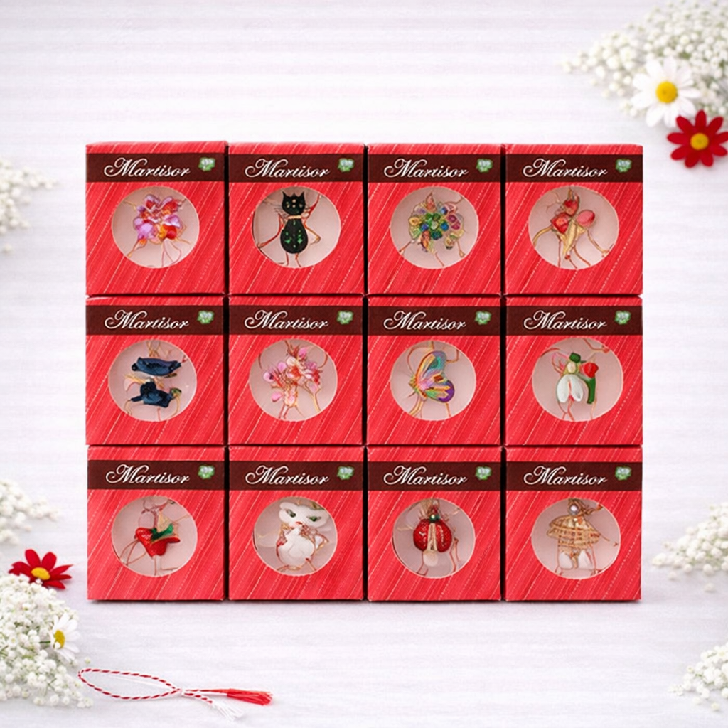 Set 36 Brose Martisor Traditionale in Cutie Individuala, Costume Populare, Cadou 1 Martie 4x4 cm