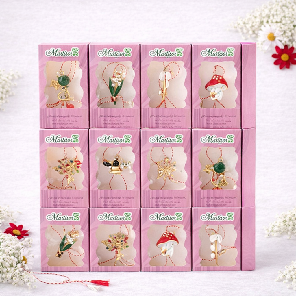 Set 24 Brose Martisor Metalice cu Snur Traditional, Ambalate Individual, Cadou 1 Martie 11x6 cm