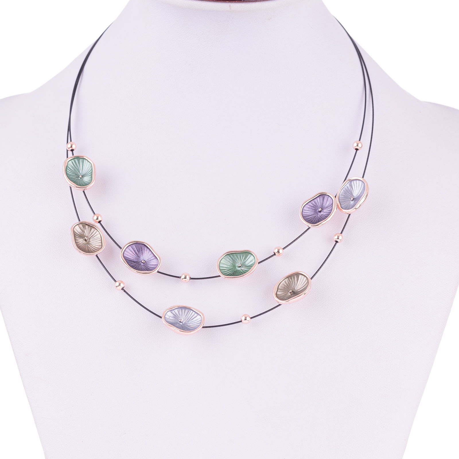 Colier cu doua fire metalice inegale si elemente ovale aurii cu mov si verde