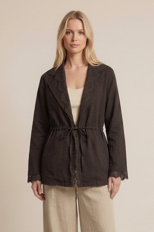 Jacheta lejera cu snur in talie si insertii dantela, stil elegant natural, maro Talie unica