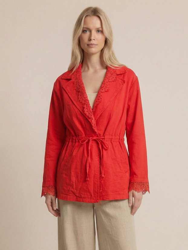 Jacheta lejera cu snur in talie si insertii dantela, stil elegant natural, rosie Talie unica