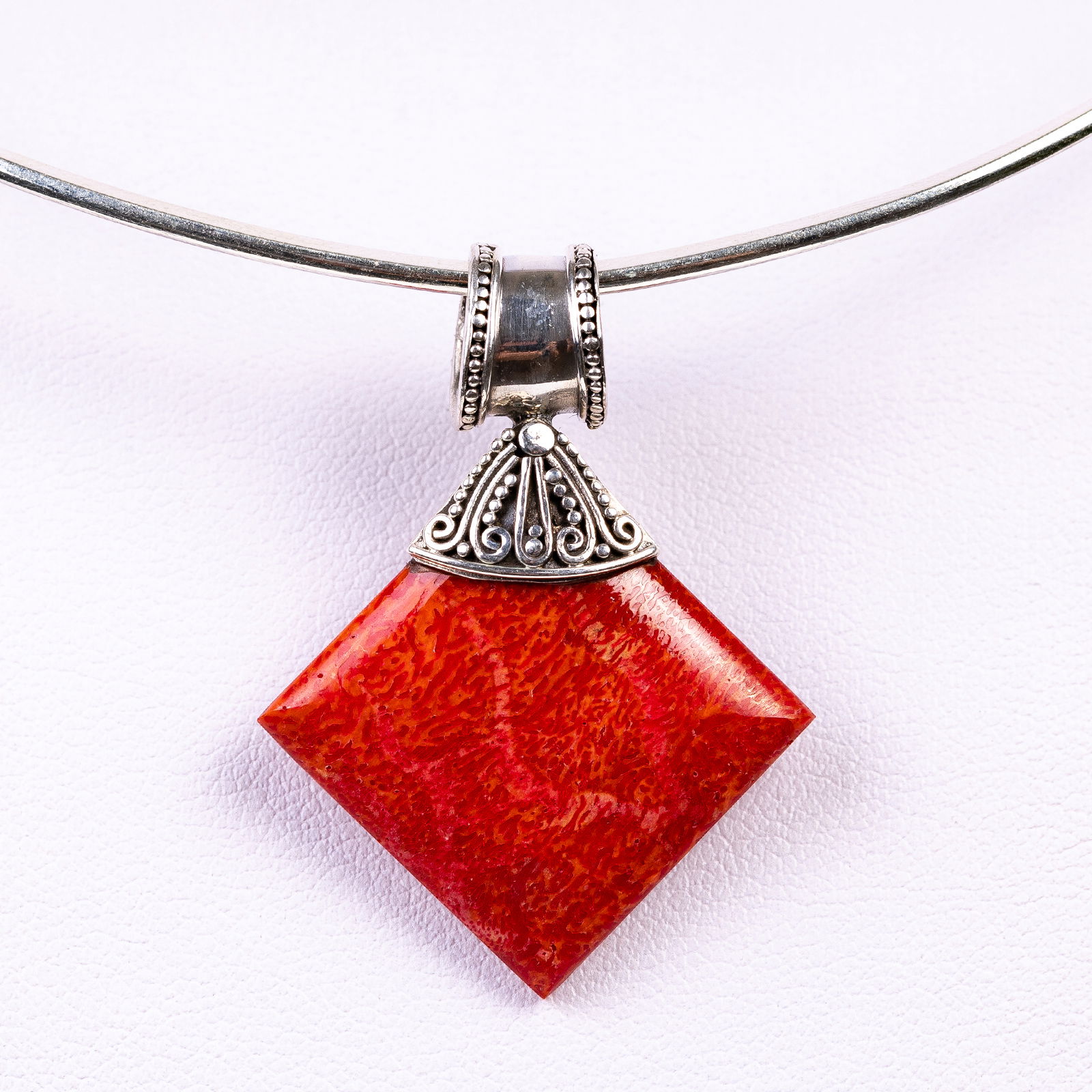 Pandant rombic cu coral natural si cu decoratiune din argint 925 Marime unica