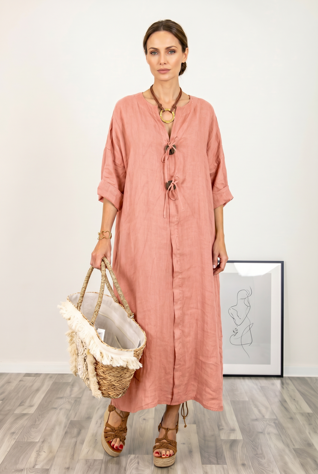 Rochie tunica din in roz prafuit, cu nasture metalic decorativ Talie unica