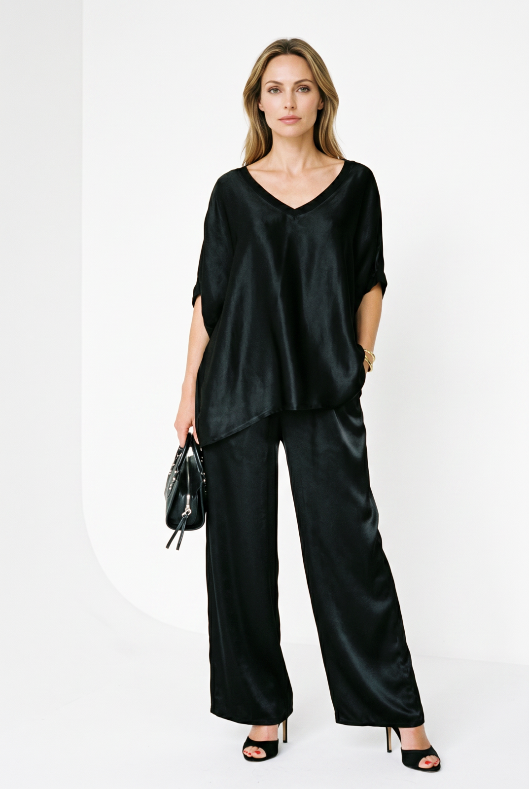 Compleu cu pantaloni, din vascoza, cu aspect lucios satinat, negru Talie unica