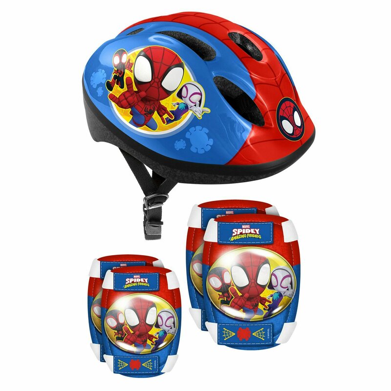 Set casca protectie, genunchiere si cotiere, Stamp, Spidey, Sigure si confortabile, Reglabile, Conform cu EN1078, Marime 50/56 cm, 3 ani+, Albastru/Rosu