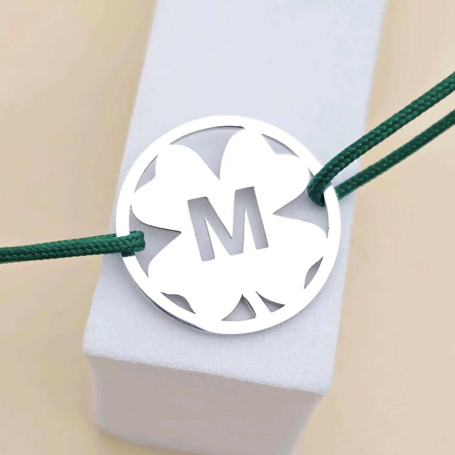 Bratara disc si trifoi - Initiala personalizata - Argint 925- Snur reglabil, diverse culori