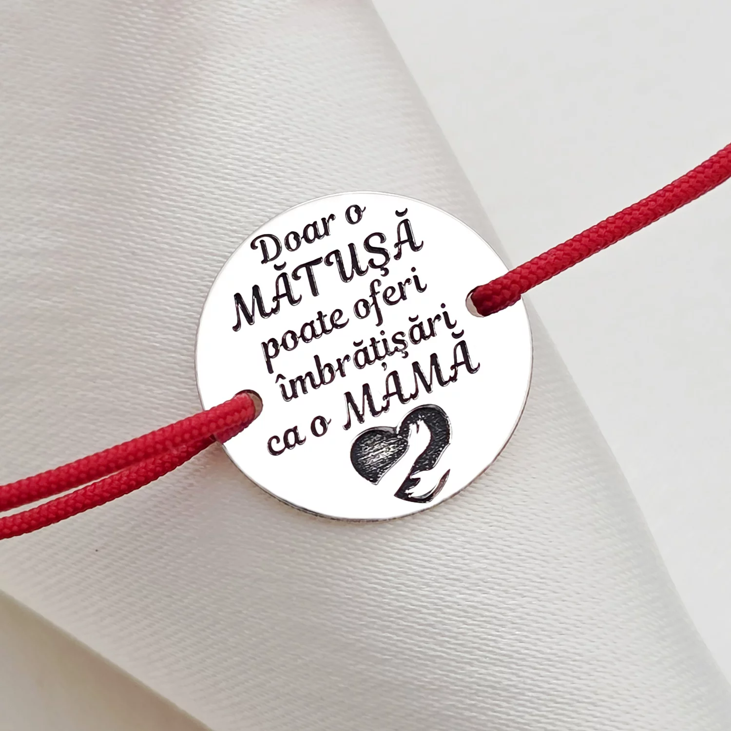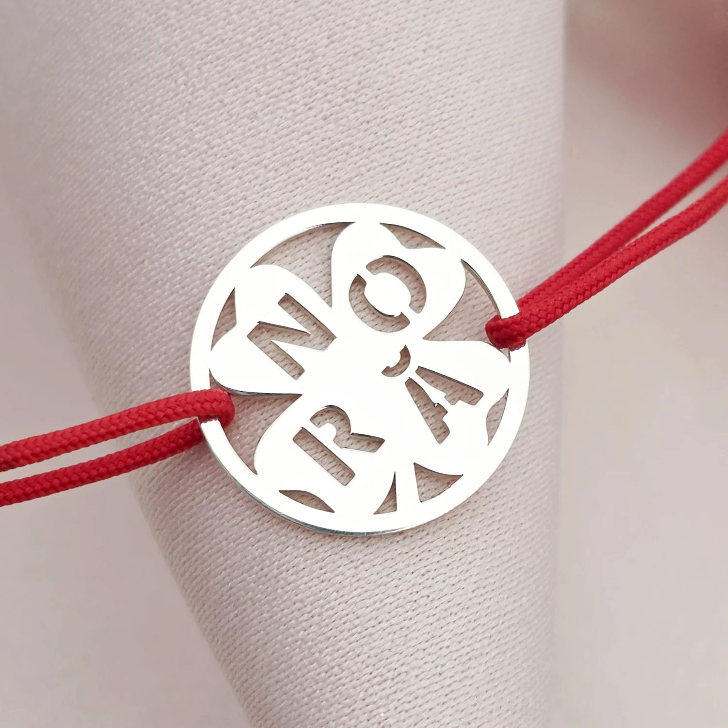 Bratara disc si nume decupat - Mama si floare cu email rosu - Argint 925 - Snur reglabil, diverse culori