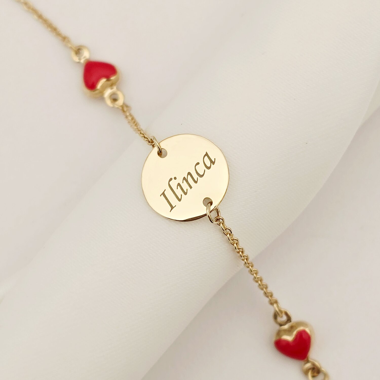 Bratara Chic Baby - Banut personalizat si Inimioare cu email rosu - Lantisor ajustabil - Aur Galben 9K