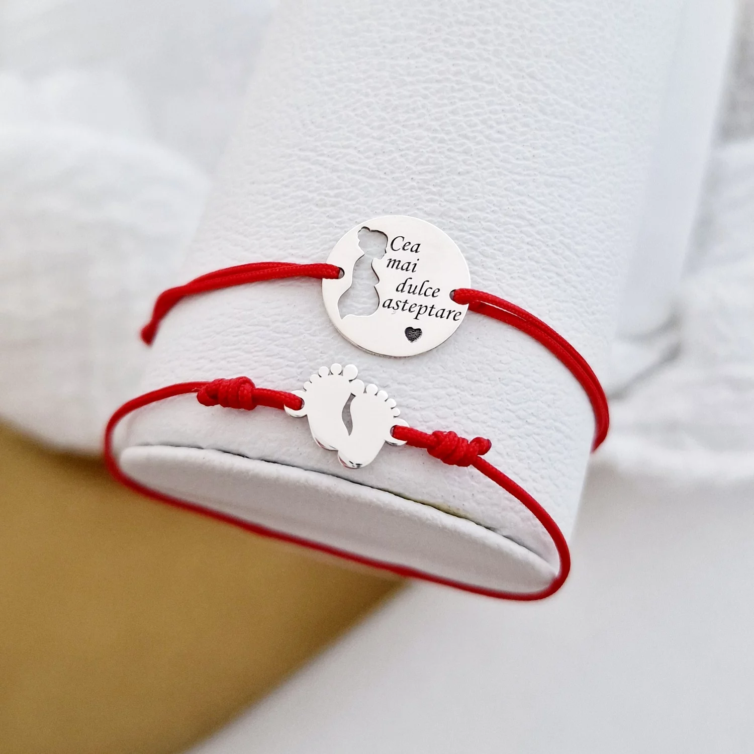 Set 2 bratari - Cea mai dulce asteptare - Bratara banut viitoare mamica 15 mm - Bratara picioruse 10x12 mm bebe - Argint 925 - snur reglabil