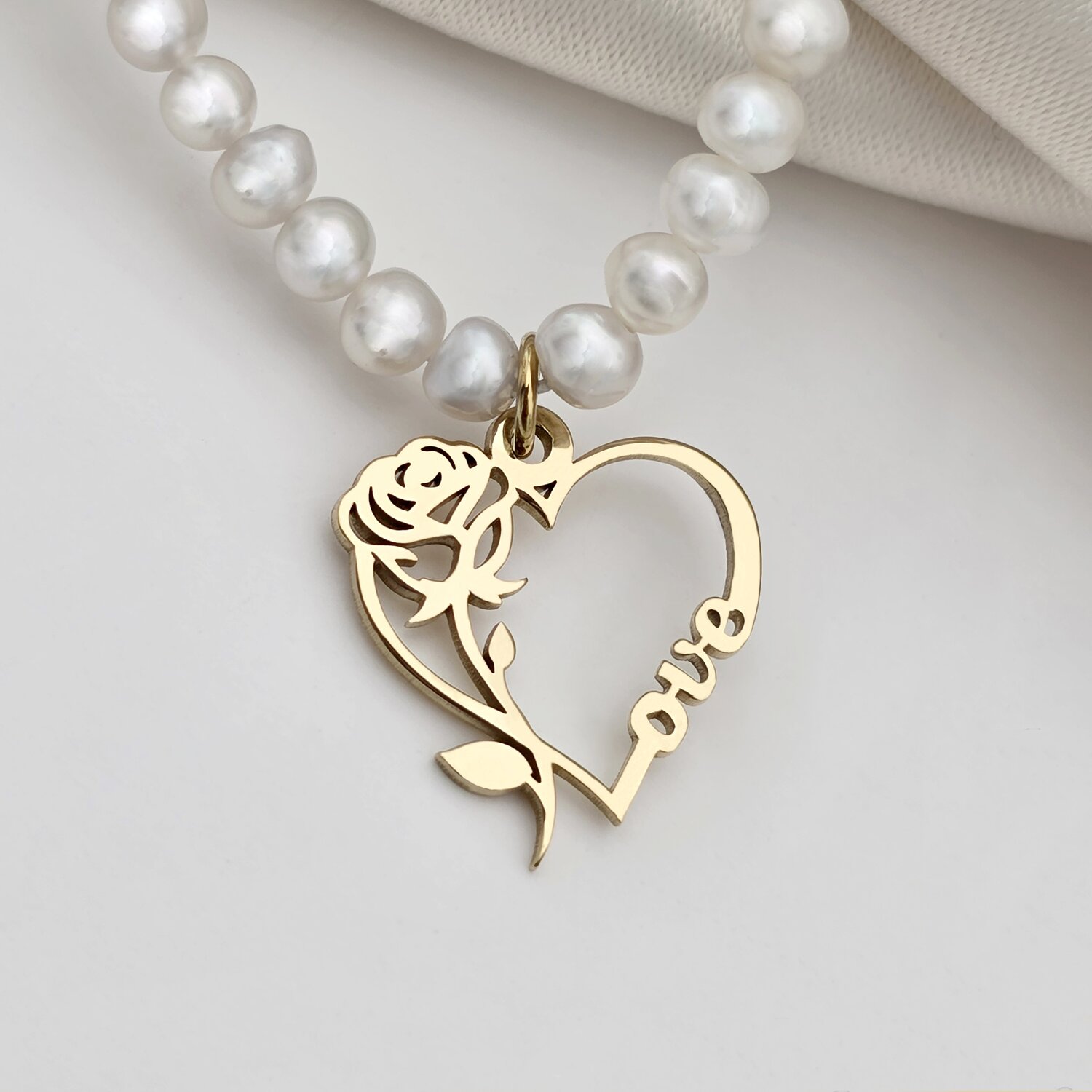 Colier Belle - Pandantiv cu Trandafir si LOVE & Sirag de Perle - Argint 925 placat cu Aur Galben 18K