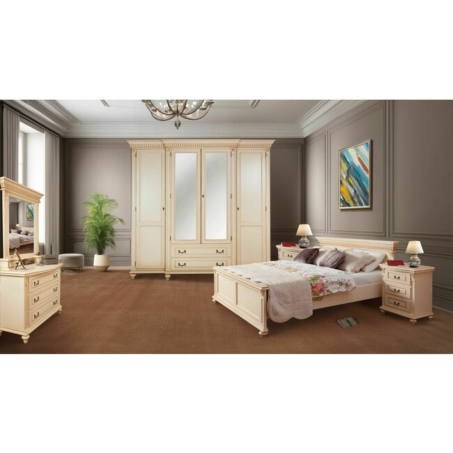 Set dormitor Floris crem cu pat, dulap și comodă din lemn masiv fag și tei, finisaj furnir nuc