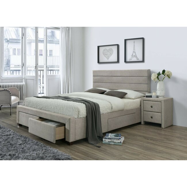 Pat Kayleon cu sertare, spațiu depozitare și design modern, stofă și lemn masiv, 160x200 cm, bej