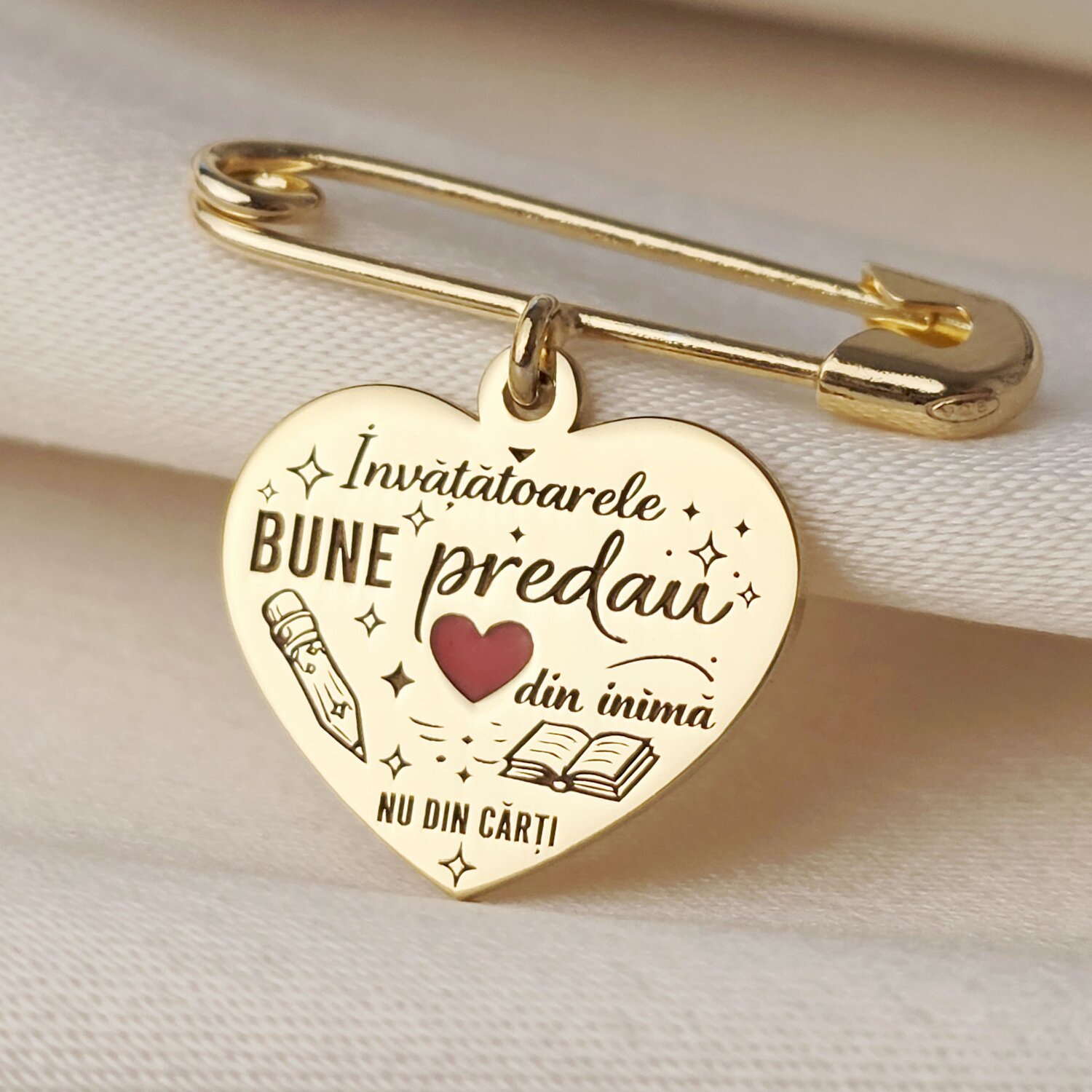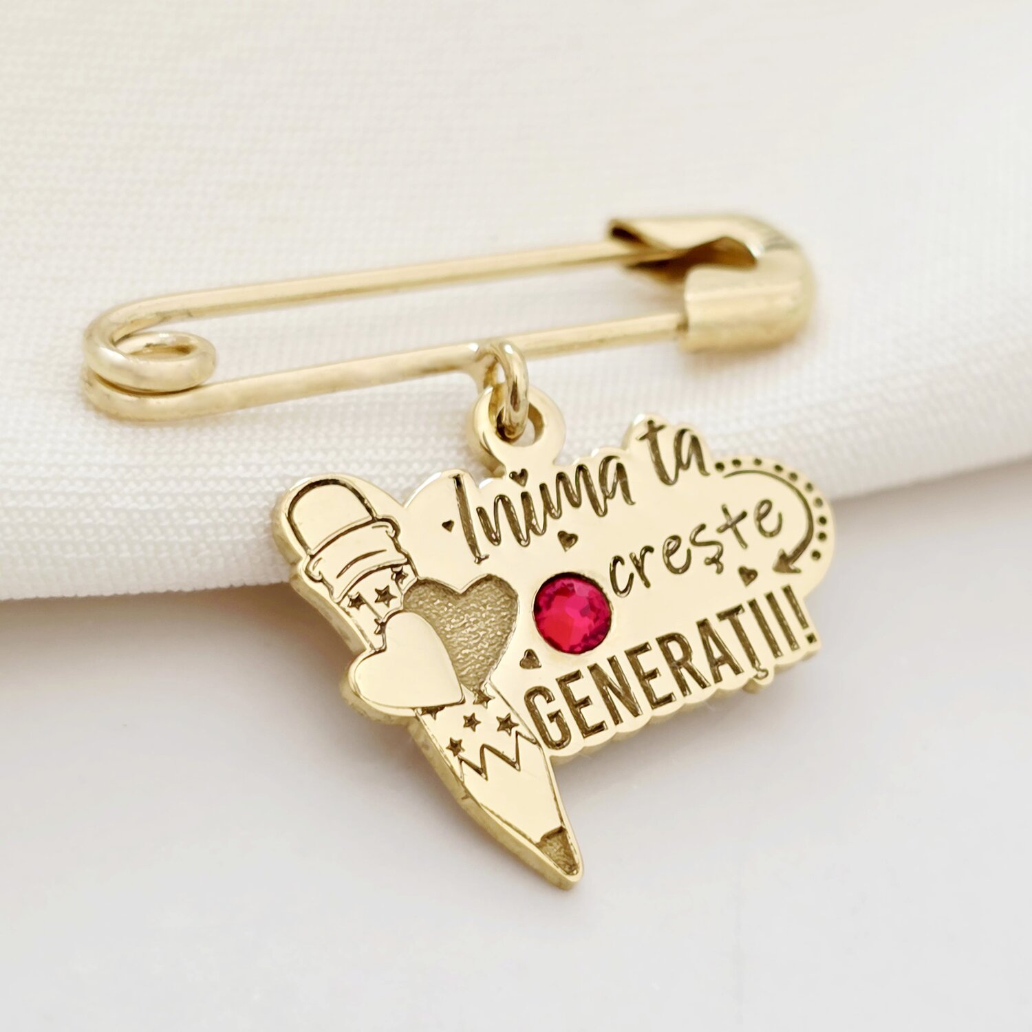 Brosa Ac de siguranta - Pandantiv inima Invatatoare - email rosu - Argint 925 placat cu Aur Galben 18K
