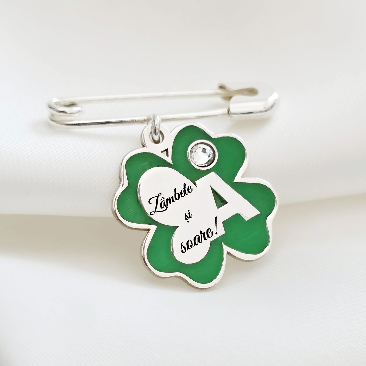 Brosa Ac de siguranta - Trifoi cu Zambete – Initiala personalizata - Argint 925 - Email verde & Cristal Swarovski