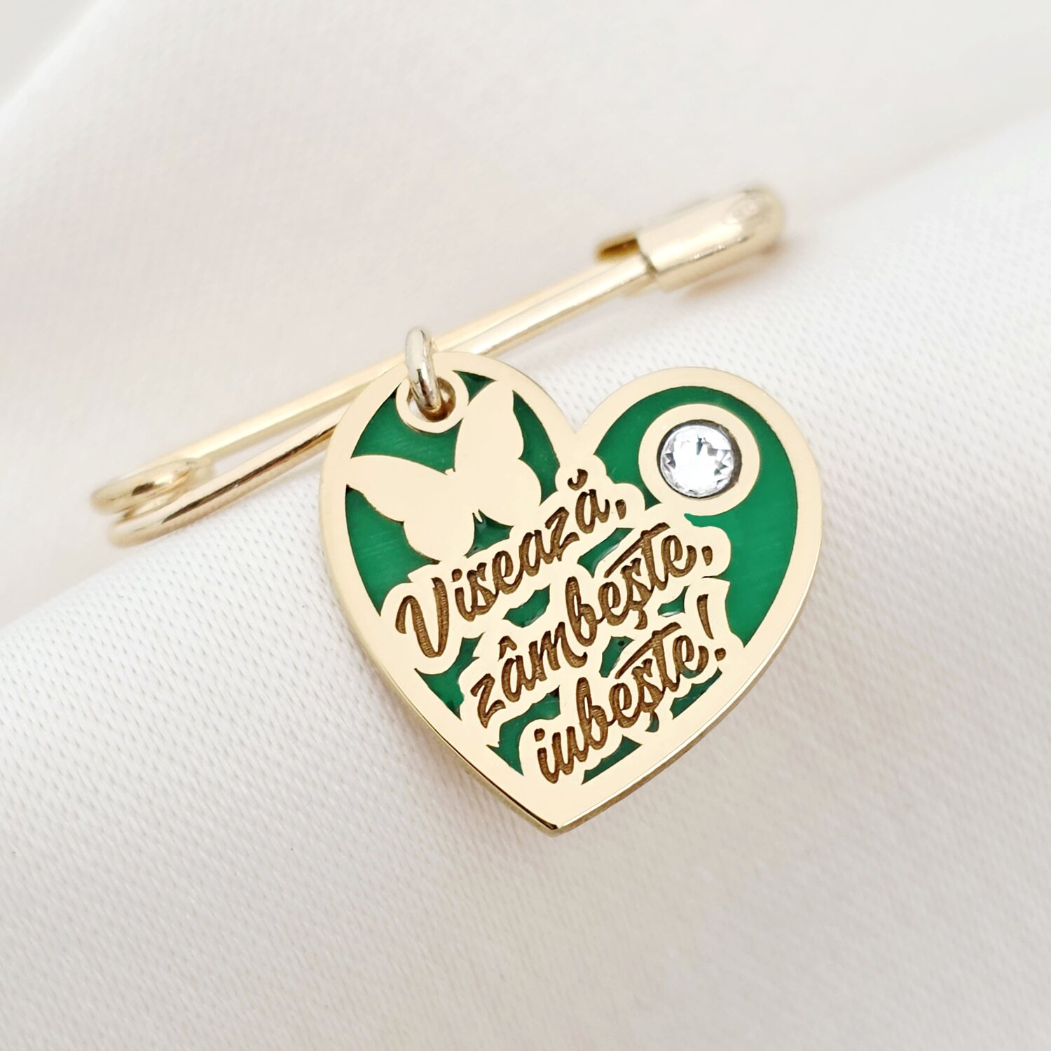 Brosa Ac de siguranta - Inima cu Zambete – Text personalizat - Argint 925 placat cu Aur Galben 18K - Email verde & Cristal Swarovski