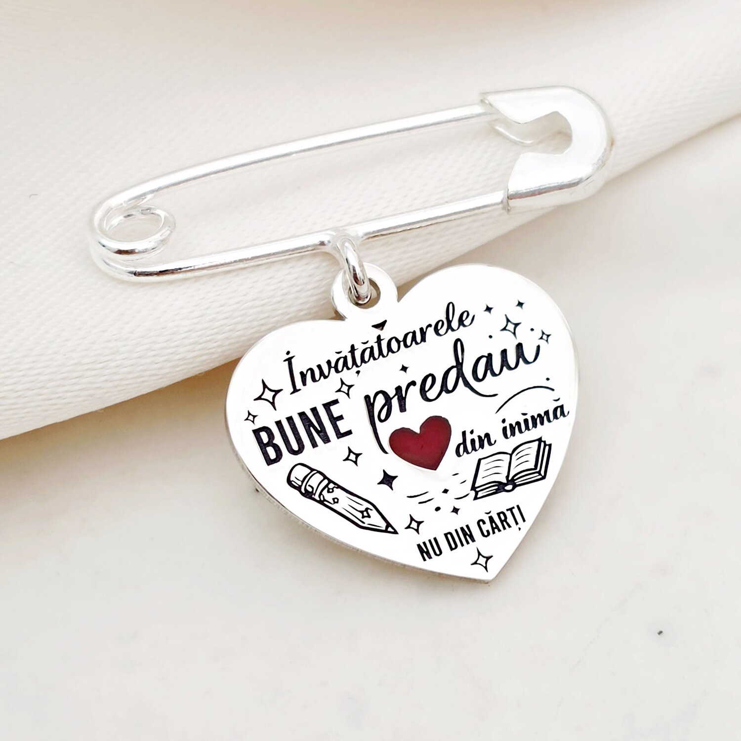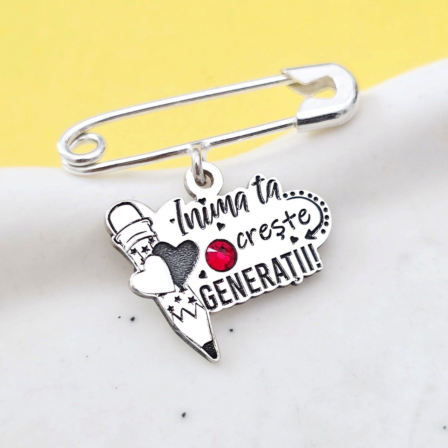 Brosa Ac de siguranta - Pandantiv inima Invatatoare - email rosu - Argint 925