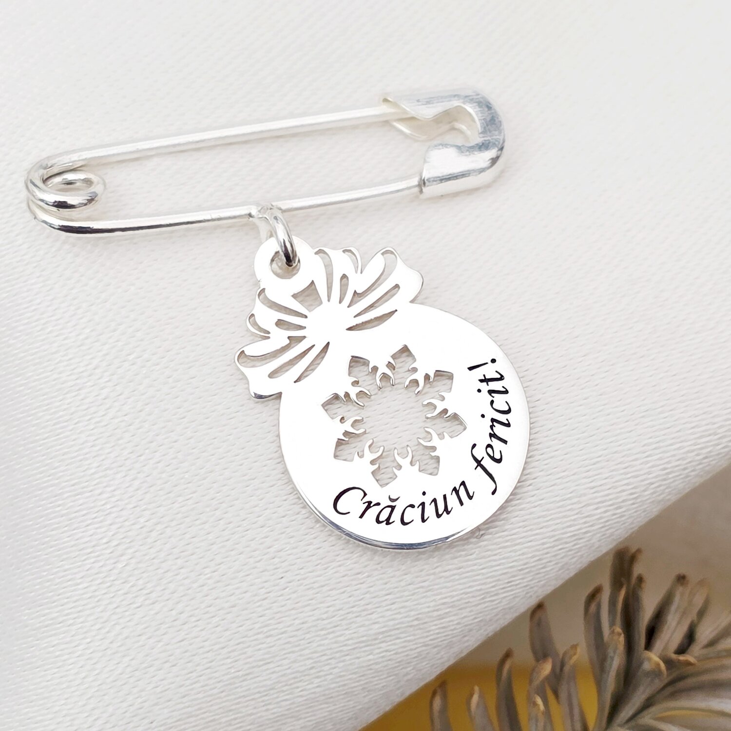Brosa Ac de siguranta - Pandantiv Glob cu fulg de nea decupat– Argint 925
