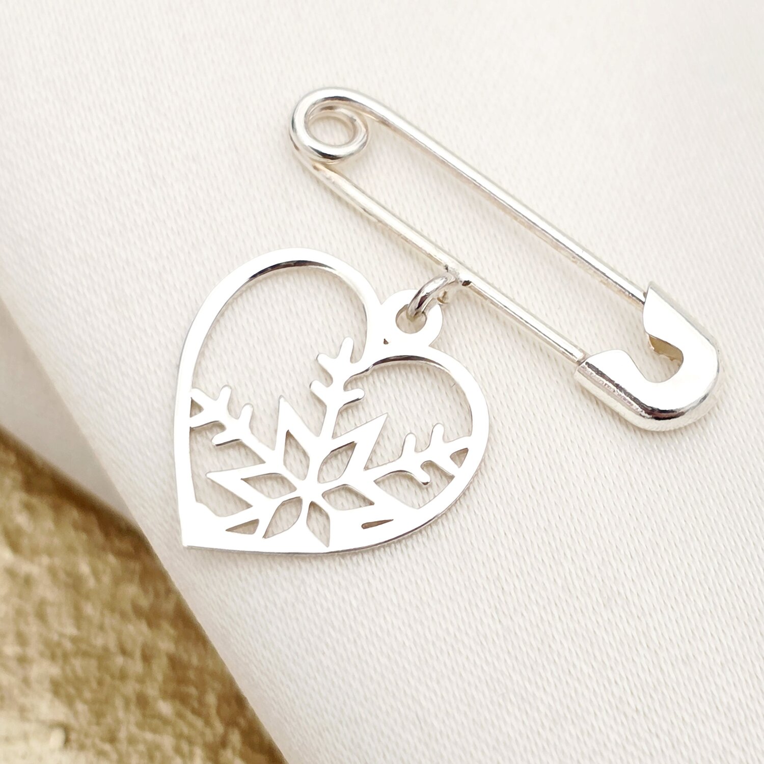 Brosa Ac de siguranta - Pandantiv Inima cu fulg de nea decupat– Argint 925