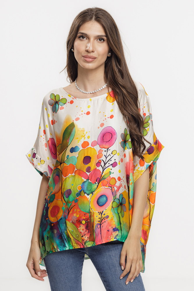Bluza amestec matase cu vascoza, imprimeu pictural cu flori si elemente geometrice Talie unica