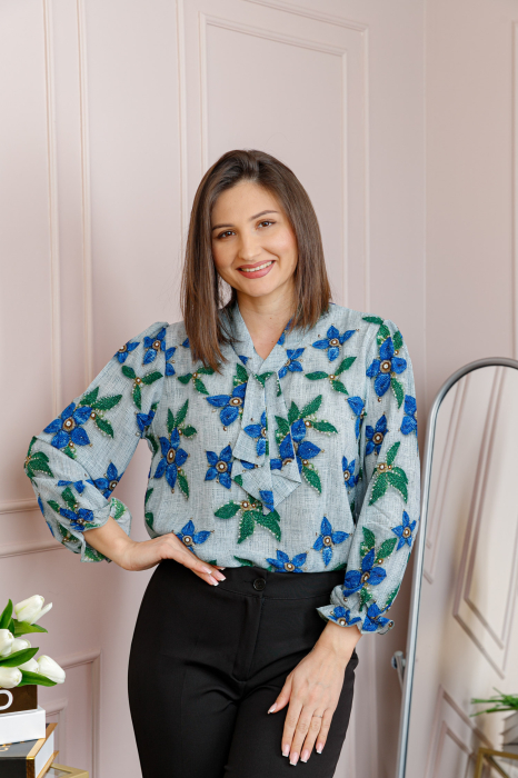 Bluza eleganta Sophie cu aplicatie tip cravata si imprimeu gri si albastru regal
