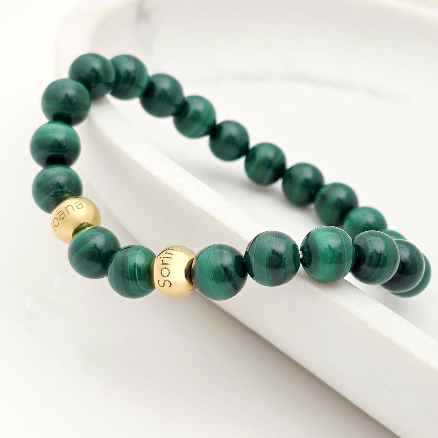 Bratara pietre semipretioase Malachit de 8 mm - Bilute din Argint 925 placat cu Aur Galben 18K - Snur elastic