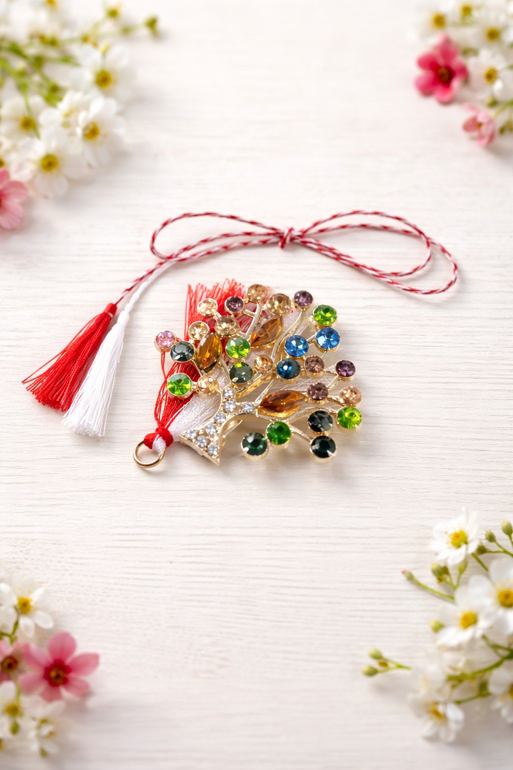 Brosa Martisor 5 cm, Copac cu cristale, in cutie 9x9 cm cu fereastra, cadou 1 Martie