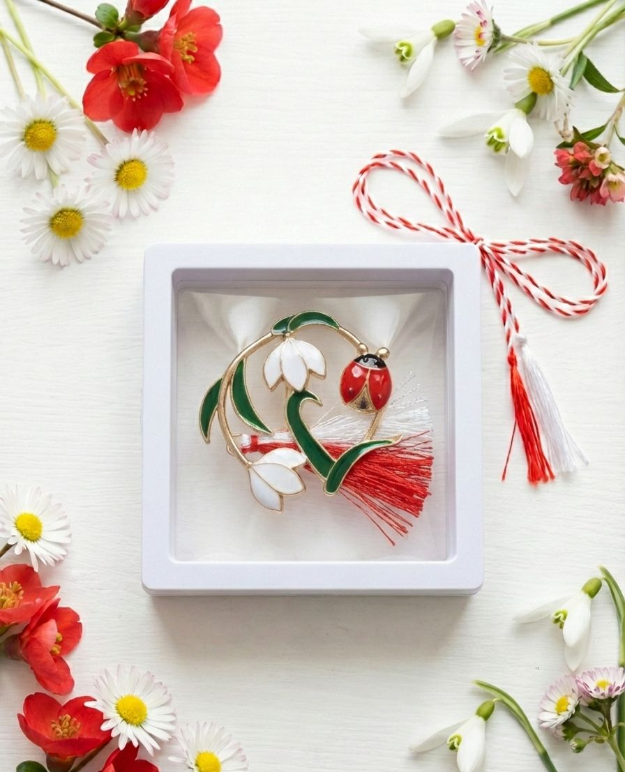 Brosa Martisor 5 cm, Ghiocei cu buburuza, in cutie 9x9 cm cu fereastra, cadou 1 Martie