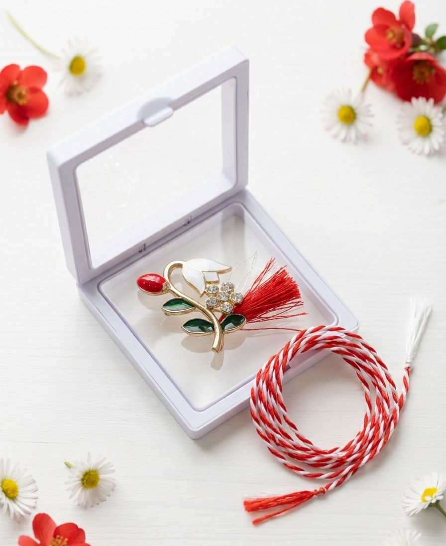 Brosa Martisor 5 cm, Funda cu cristale, in cutie 9x9 cm cu fereastra, cadou 1 Martie