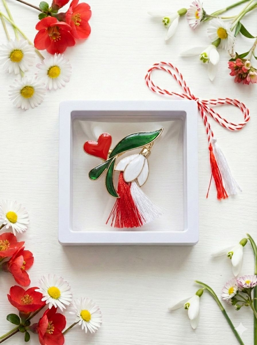 Brosa Martisor 5 cm, Ghiocel cu inima, in cutie 9x9 cm cu fereastra, cadou 1 Martie