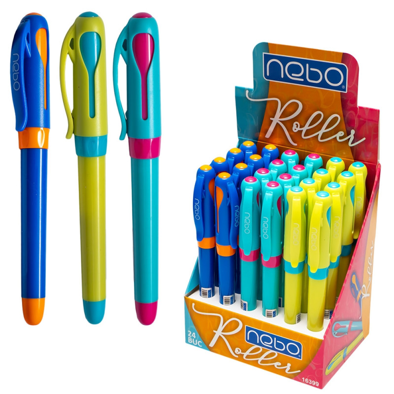 Roller cu cerneala albastra, clips de prindere, corp in diverse culori
