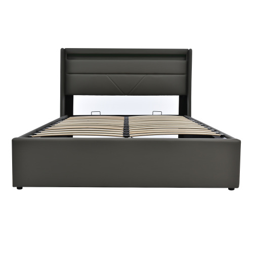 Pat dublu cu ladă de depozitare, cu LED și telecomandă, structură tapițată 140x200 cm, Gri