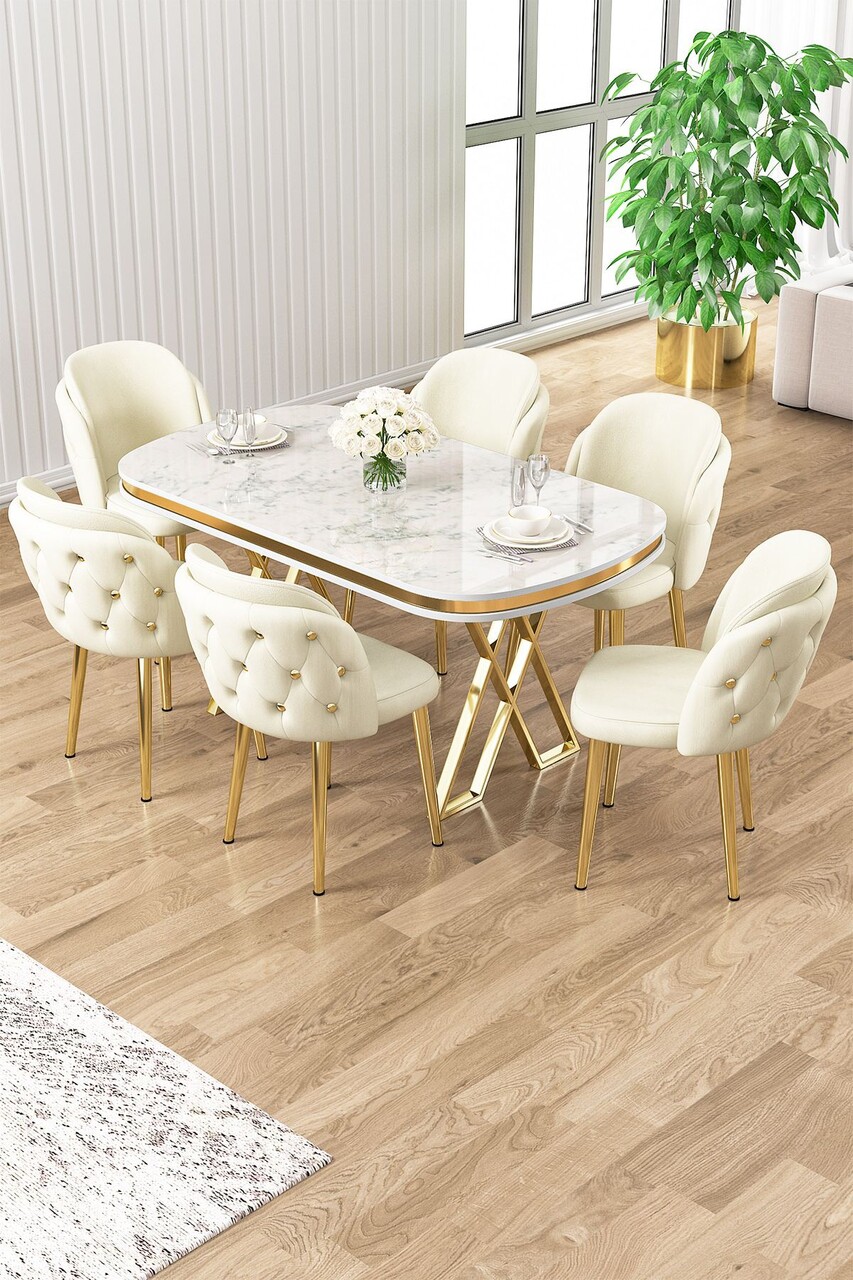 Set masă și scaune (7 piese), Hanah Home, Zae, Marmură albă / Auriu / Crem