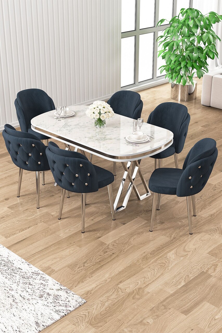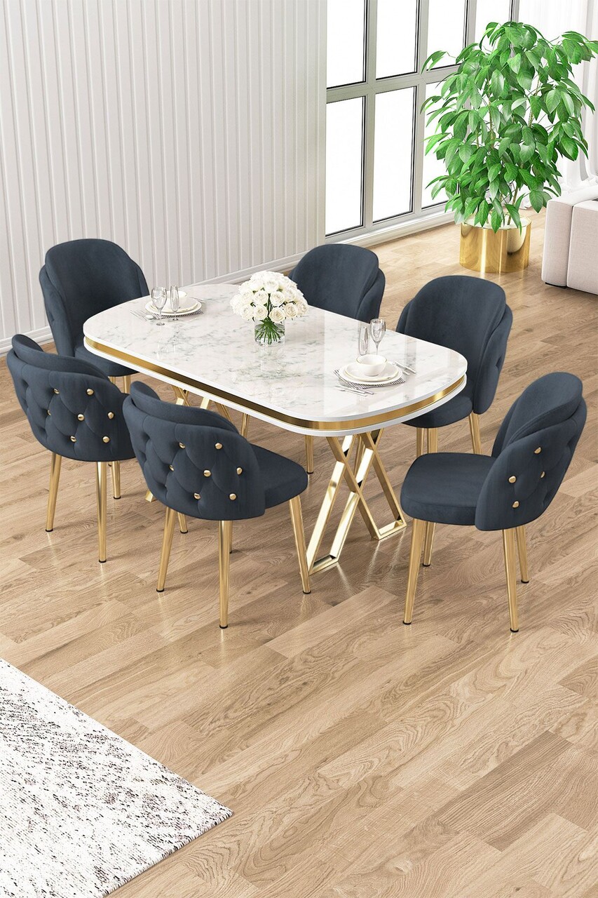 Set masă și scaune (7 piese), Hanah Home, Zae, MARMURĂ ALBĂ CROM / NEGRU