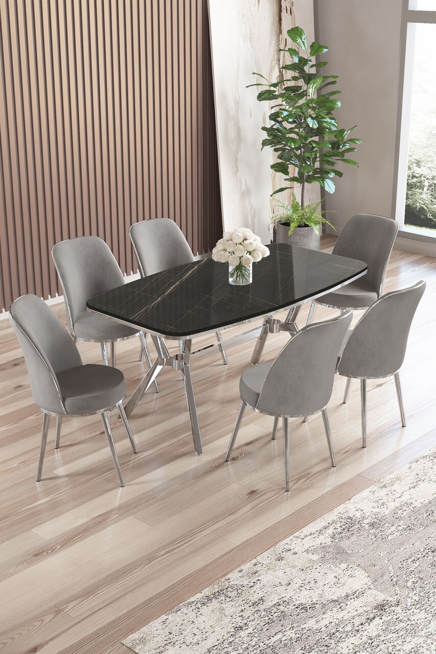 Set masă și scaune (7 piese), Hanah Home, Olya, Marmură neagră / Crom / Gri