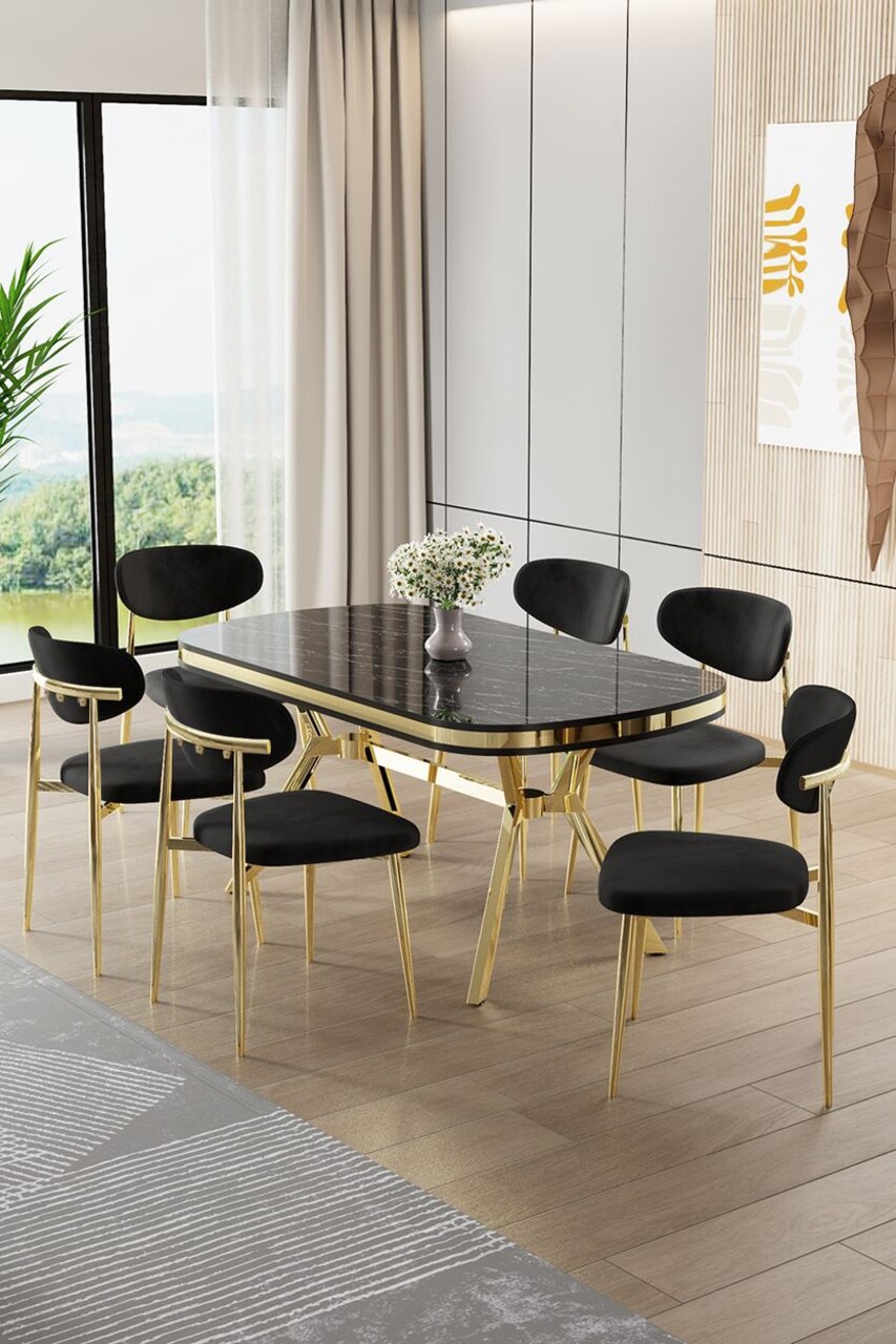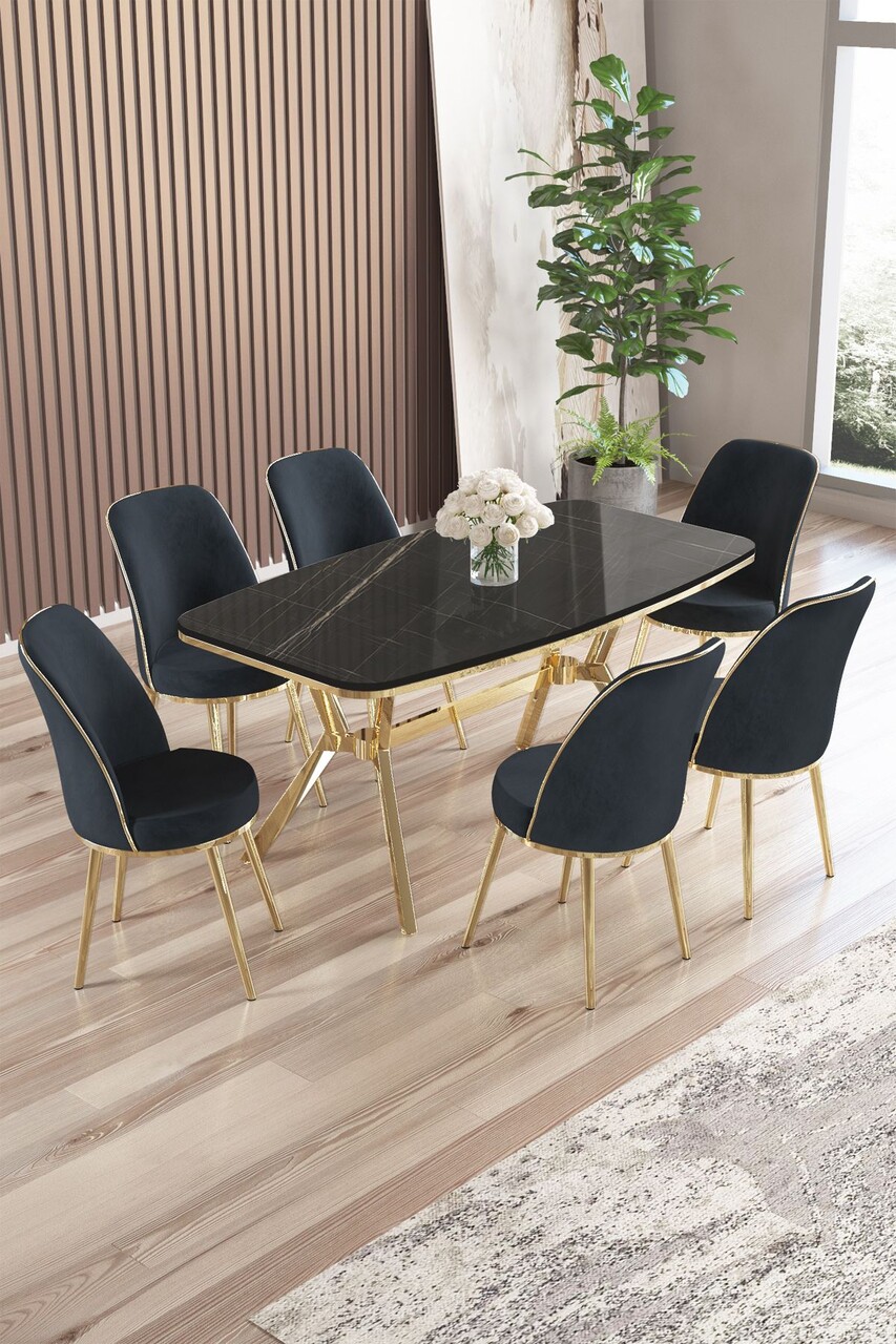 Set masă și scaune (7 piese), Hanah Home, Zae, Marmură neagră / Auriu / Negru