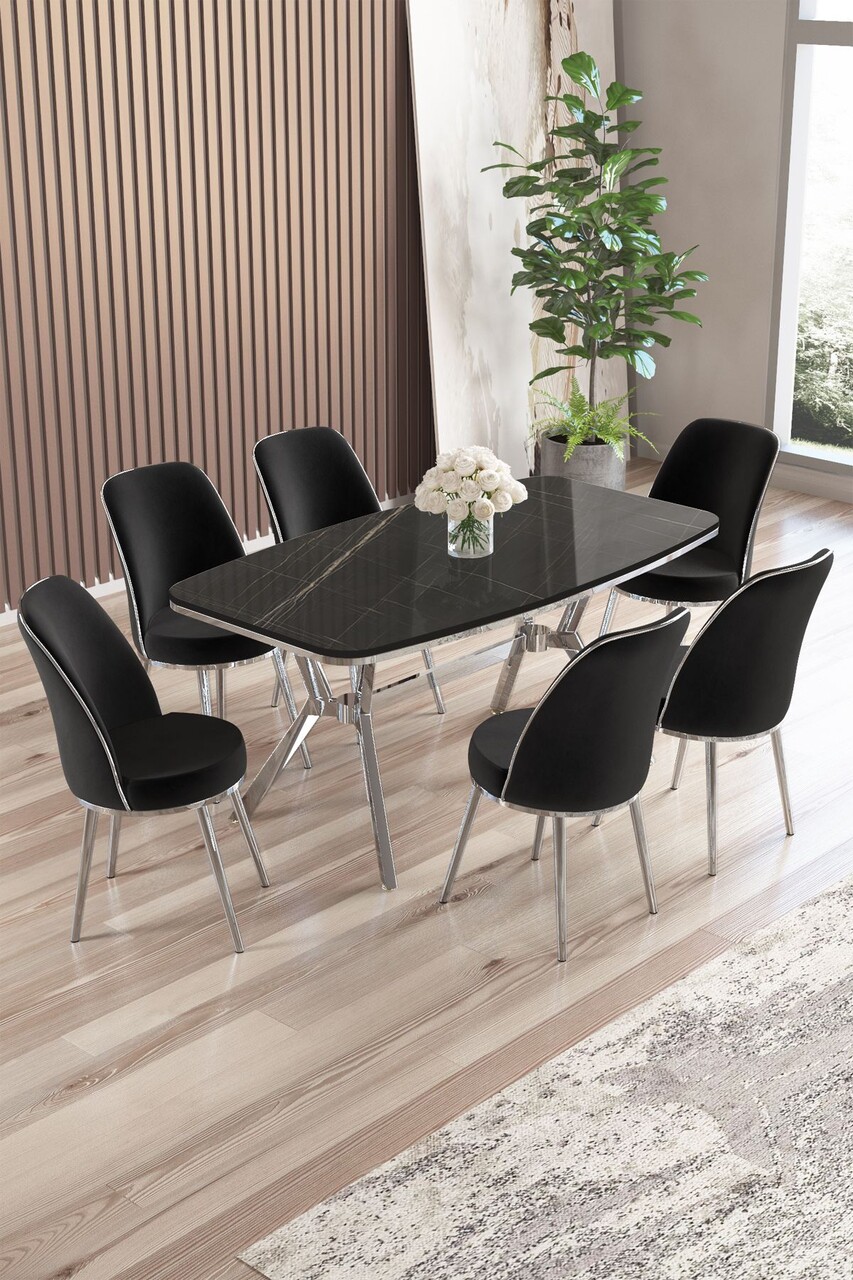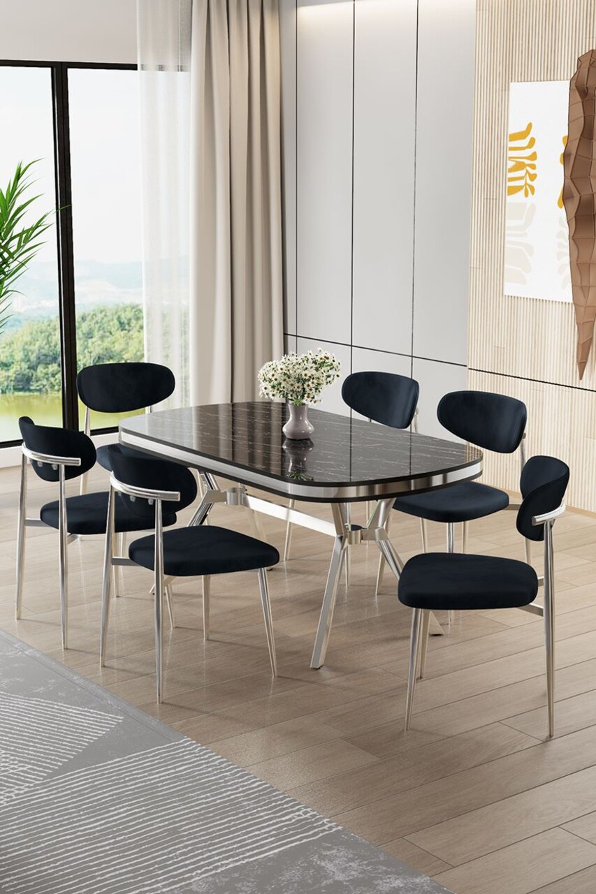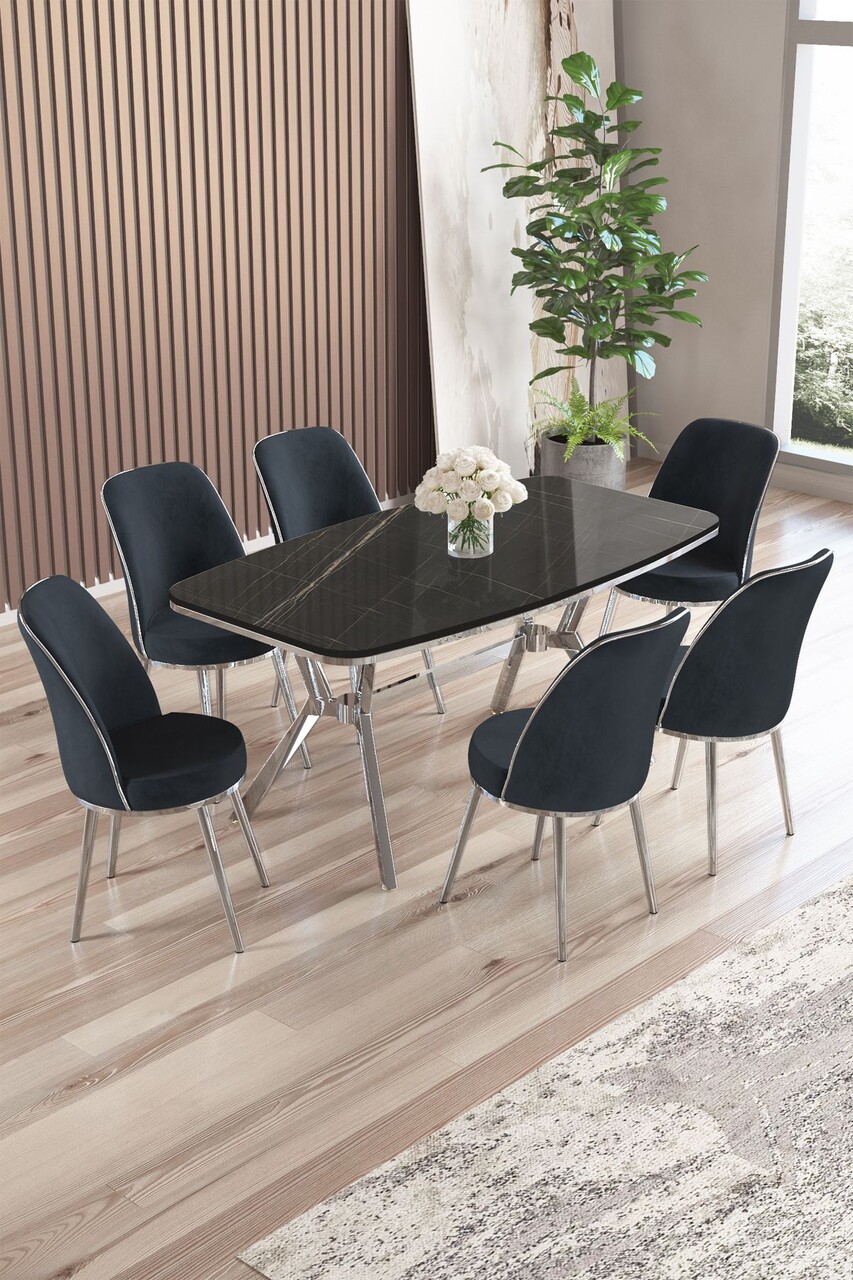 Set masă și scaune (7 piese), Hanah Home, Zae, Marmură neagră / Crom / Antracit