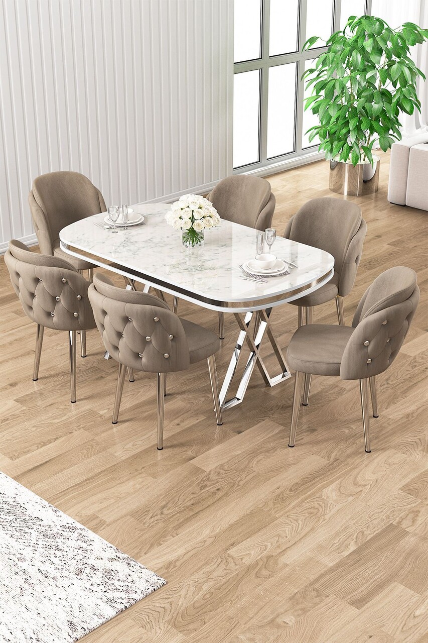 Set masă și scaune (7 piese), Hanah Home, Zae, Marmură albă / Crom / Cappuccino