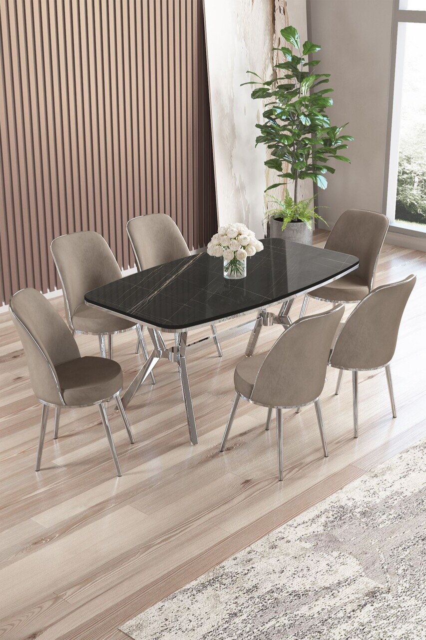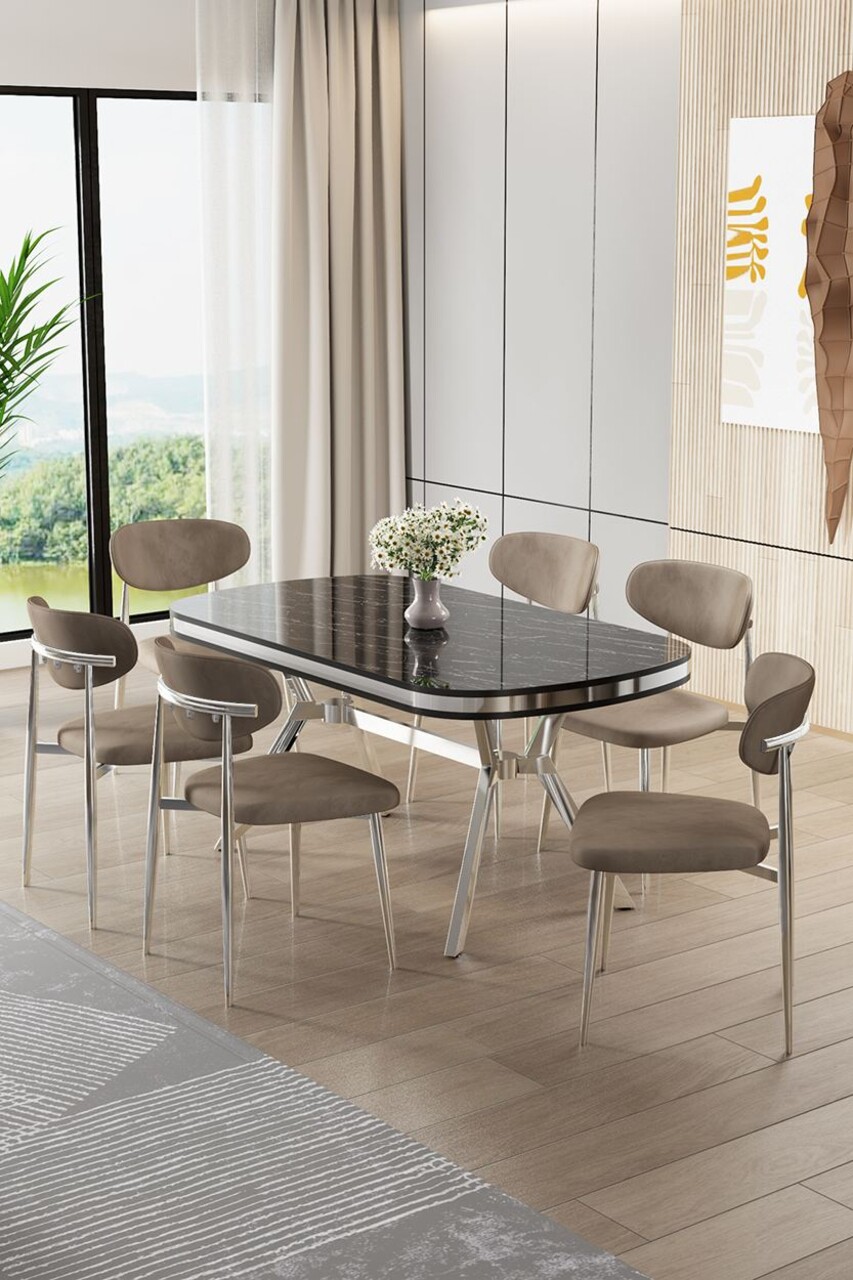 Set masă și scaune (7 piese), Hanah Home, Olya, Marmură neagră / Crom / Cappuccino