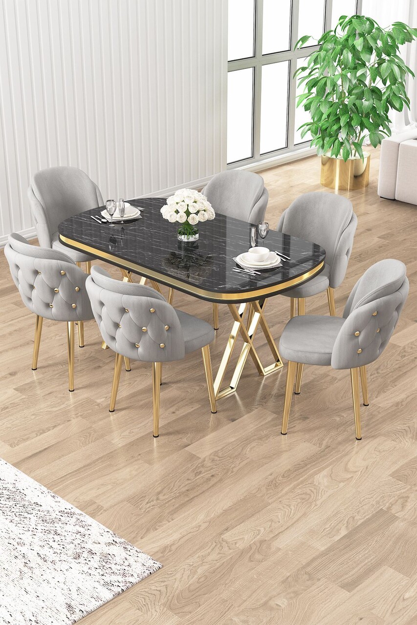 Set masă și scaune (7 piese), Hanah Home, Zae, Marmură neagră / Auriu / Gri