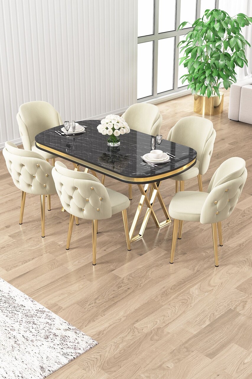 Set masă și scaune (7 piese), Hanah Home, Olya, Marmură neagră / Auriu / Crem