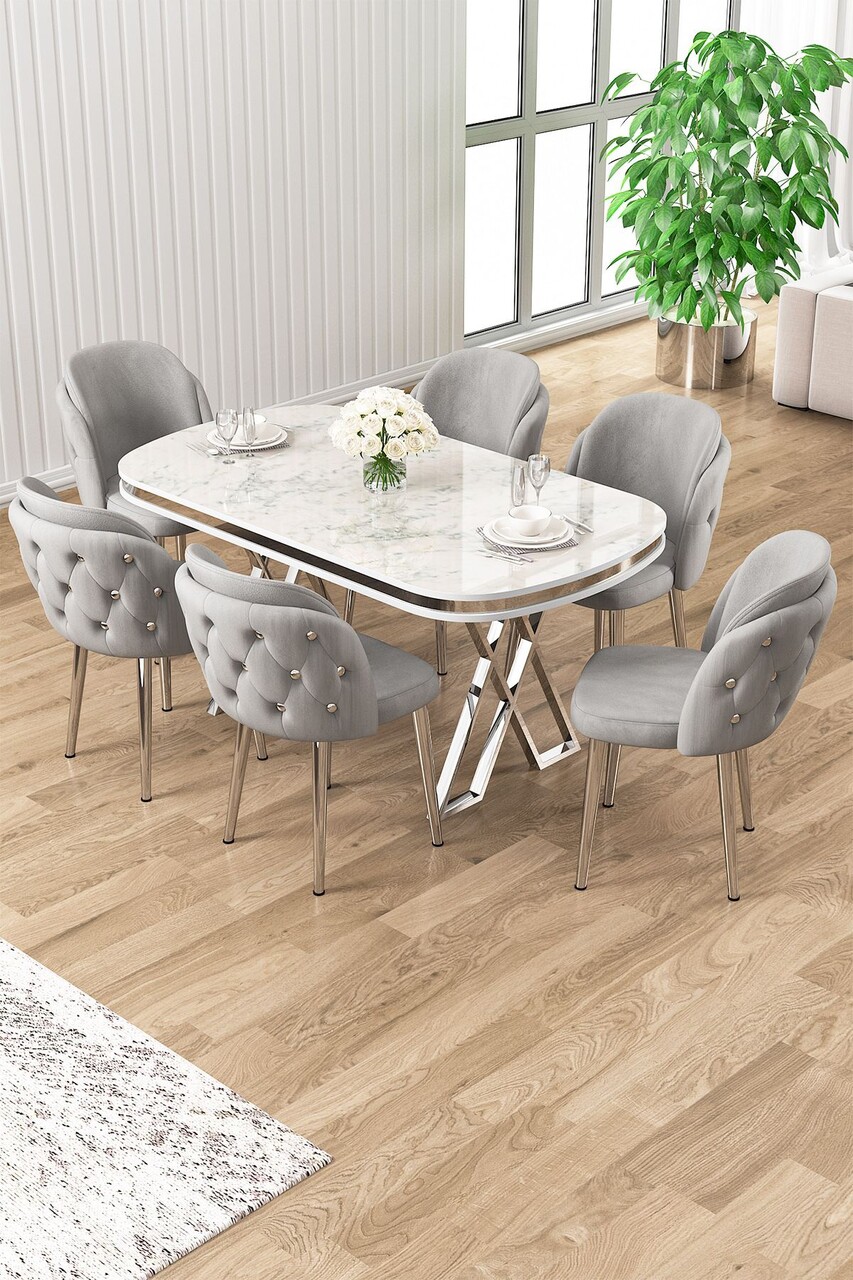 Set masă și scaune (7 piese), Hanah Home, Zae, Marmură albă / Crom / Gri