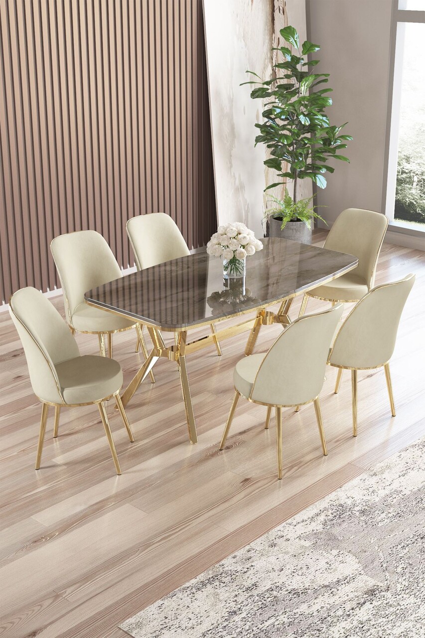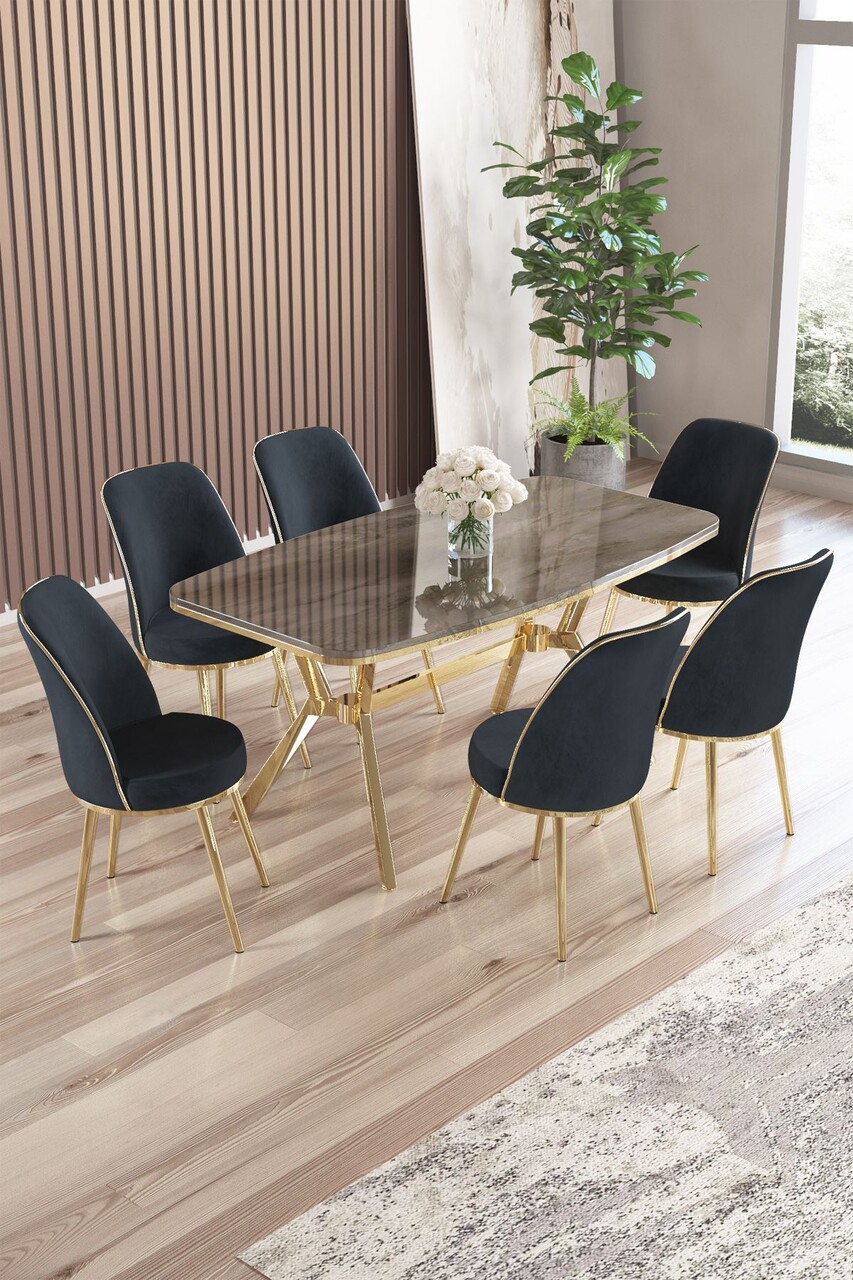 Set masă și scaune (7 piese), Hanah Home, Olya, Marmură neagră / Auriu / Cappuccino