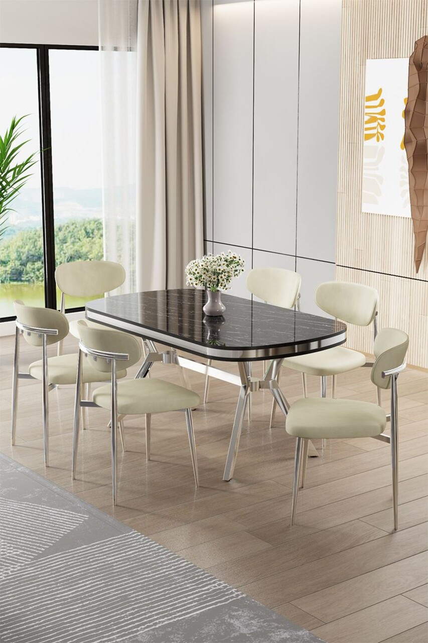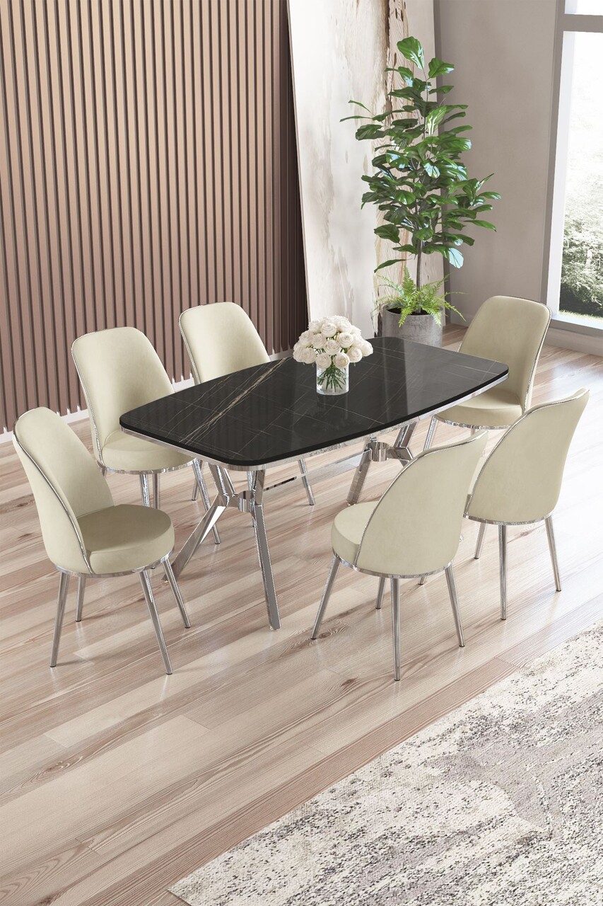 Set masă și scaune (7 piese), Hanah Home, Olya, Marmură neagră / Crom / Crem