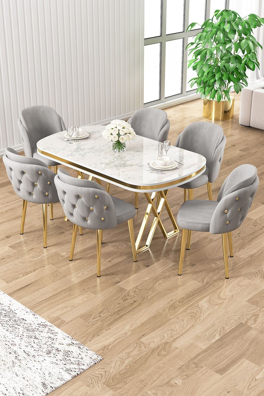 Set masă și scaune (7 piese), Hanah Home, Zae, Marmură albă / Auriu / Gri