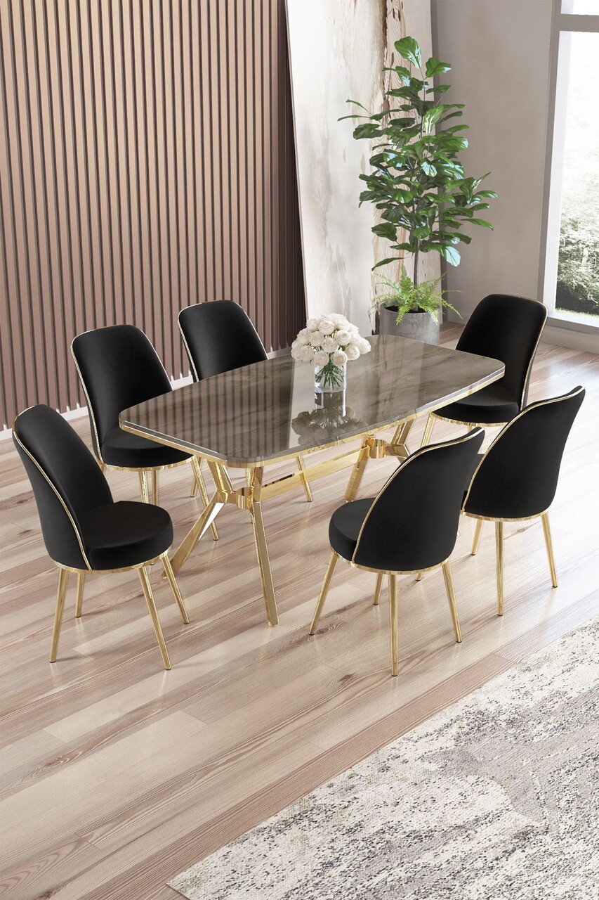 Set masă și scaune (7 piese), Hanah Home, Olya, Marmură neagră / Auriu / Antracit