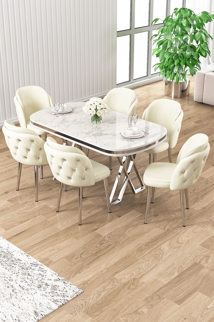 Set masă și scaune (7 piese), Hanah Home, Zae, Marmură albă / Crom / Crem