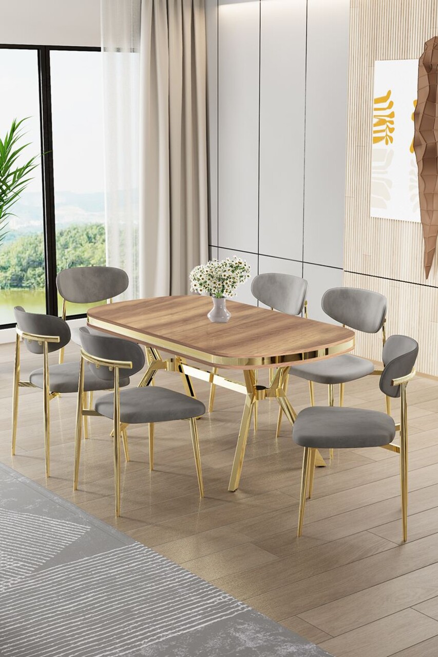 Set masă și scaune (7 piese), Hanah Home, Olya, Stejar / Auriu / Gri