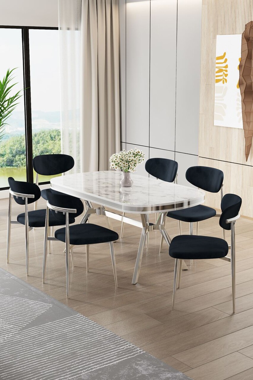 Set masa extensibila si scaune, Hanah Home, Esla, MARMURĂ ALBĂ CROM / NEGRU